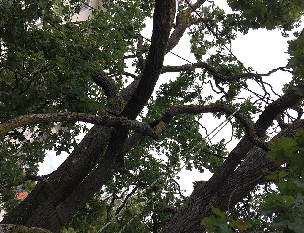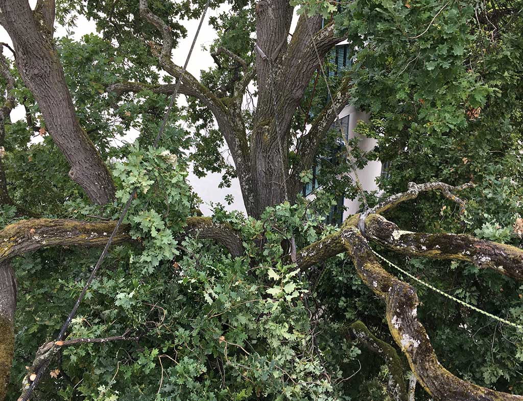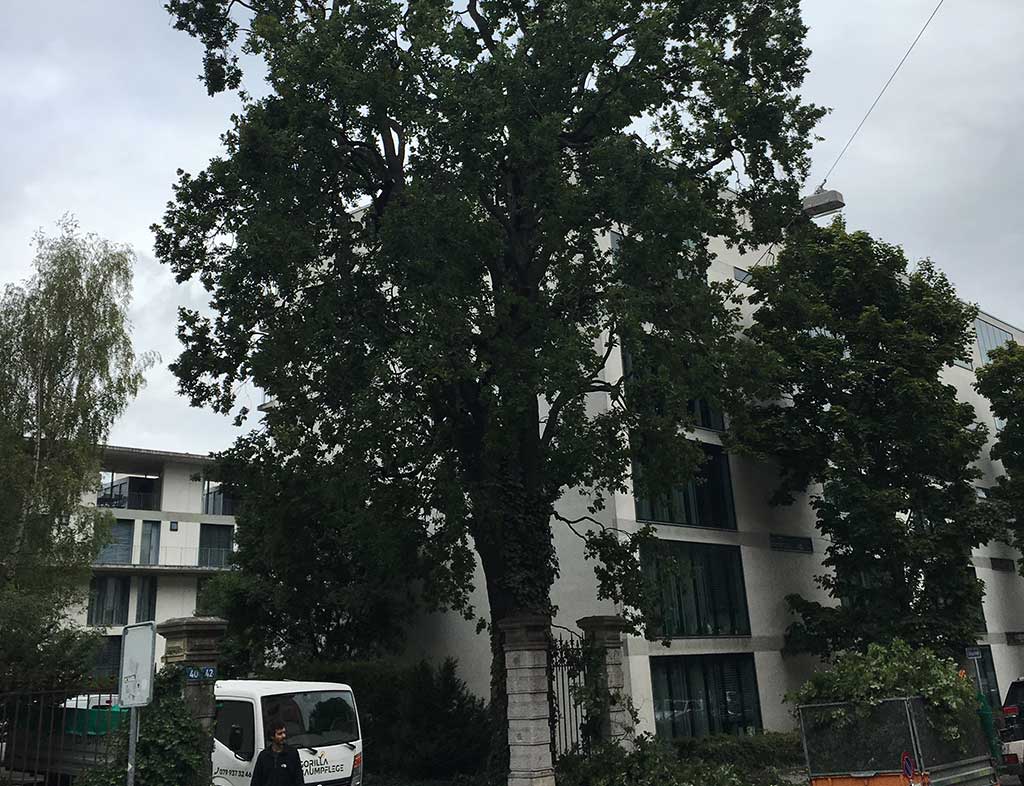 An einem grauen Montag Morgen, haben wir in Zusammenarbeit mit der Firma Gartenbau Gisin eine Stieleiche im Gellert Quartier in Basel geschnitten. Die Eiche steht nähe Seevogelplatz in einer kleinen Rabatte neben dem Trottoir und ist eine doch schon etwas älteres Exemplar. Ein schöner Baum, der in seiner Form und Gestalt das artgerechte und imposante Kronenbild sehr schön wiedergibt. Nach einem stabilen Stammfuss und starkem Stamm, sind oberhalb des Kronenansatzes regelmässig starke Seitenäste mit grosser Ausladung gewachsen. Der Hauptstamm teilt sich etwa in der Mitte der Krone in 2 Stämmlinge, welche den oberen Kronenteil und die Spitze des Baumes bilden.