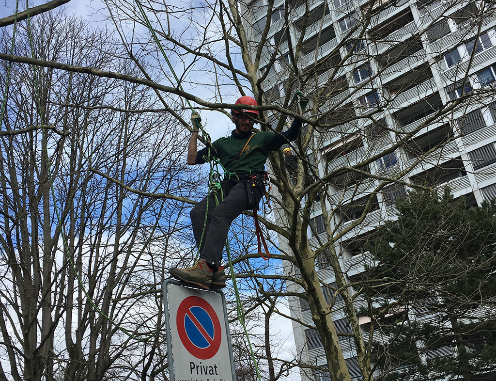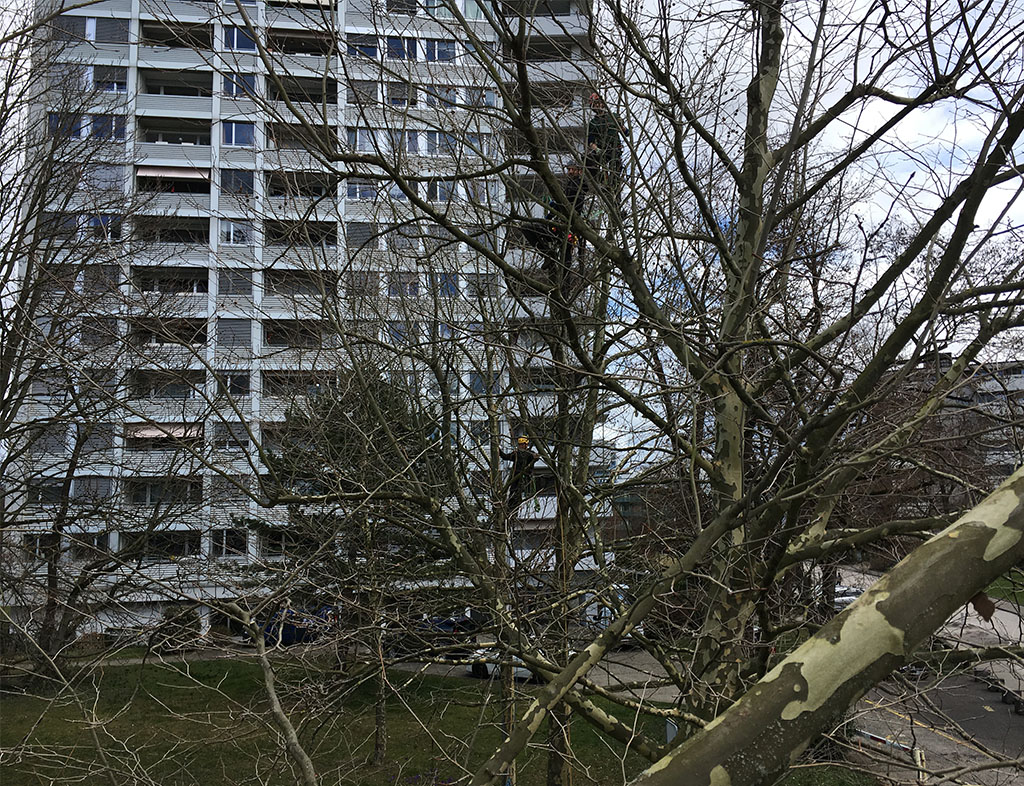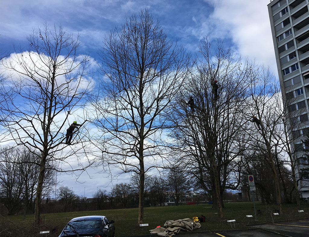 Baumpflegearbeiten mit Blick auf den Rhein in Birsfelden. Neben der Parkfläche einer Liegenschaft pflegten wir zwei dicht stehende Baumreihen. Wir führten einen Kronenkorrekturschnitt durch und hoben das Lichtraumprofil über den Parkplätzen an.
