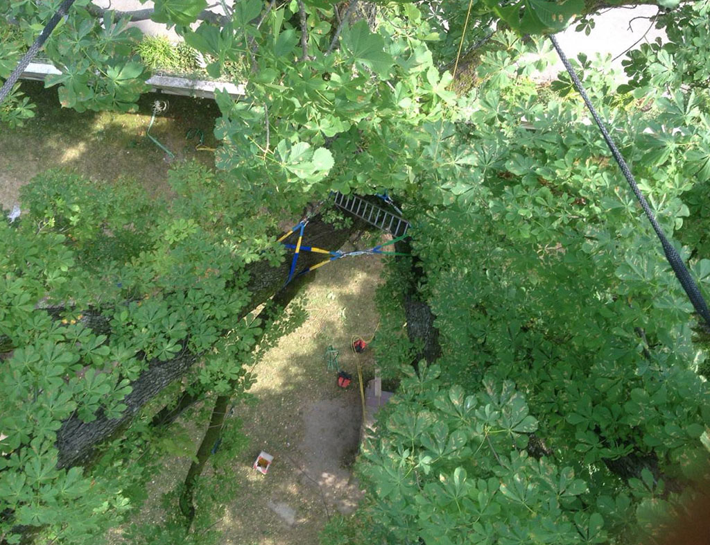 Mit Sicherungen lassen sich ausbruchgefährdete Kronenpartien stabilisieren. Bei schlecht verwachsenen Vergabelungen, stark ausladenden oder sehr schweren Kronenteilen erstellen wir dynamische oder statische Kronensicherungen. Diese verhindern ein Aufschwingen bzw. Ausbrechen von Kronenteilen und stabilisieren die Kronenstruktur nachhaltig.